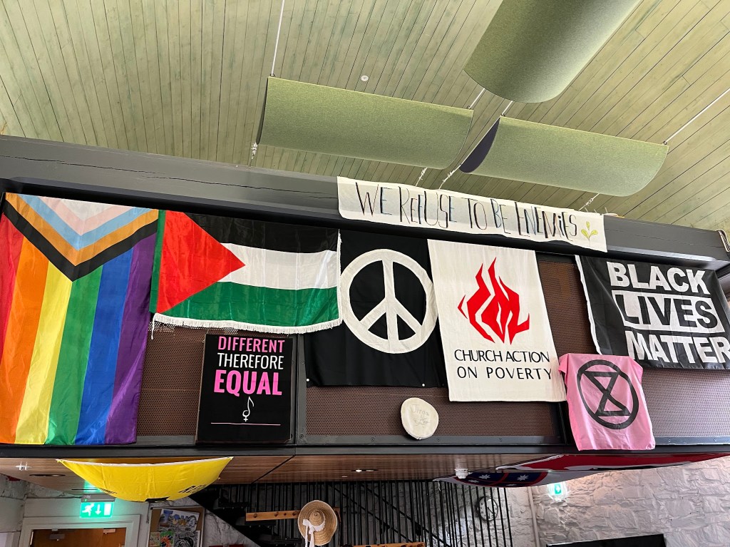 - Imbalance in representation. A large Palestinian flag is displayed in the dining hall, but there is no corresponding Israeli flag or acknowledgment of the Jewish connection to the land. The Iona Community itself has stated that the flags hanging in the dining hall represent the issues the Community cares about. Are we to infer, then, that the absence of any symbol representing the Jewish people or Israel means these concerns are not part of that care?